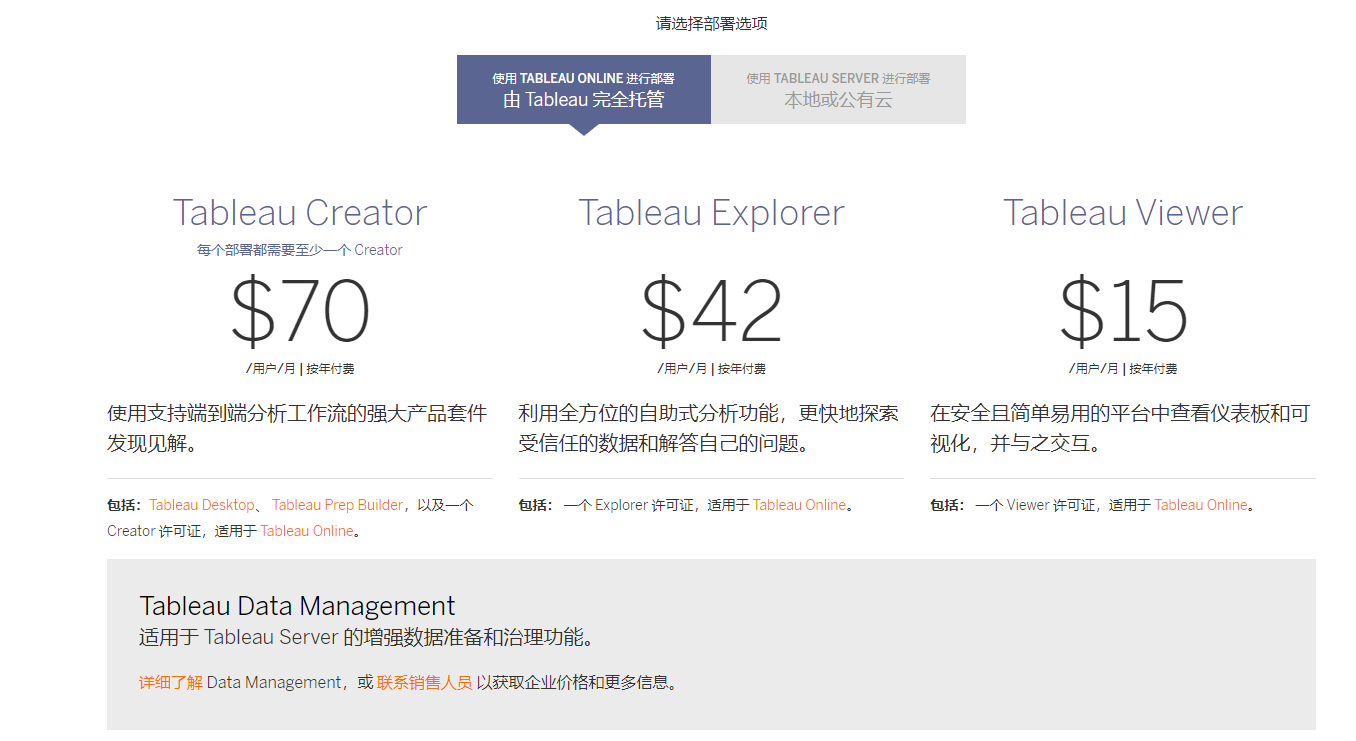 通过下图来参考Tableau的费用,Creator包含了Tableau Desktop、Tableau Prep Builder和Tableau Server。增强的数据治理和了解数据情况的Data