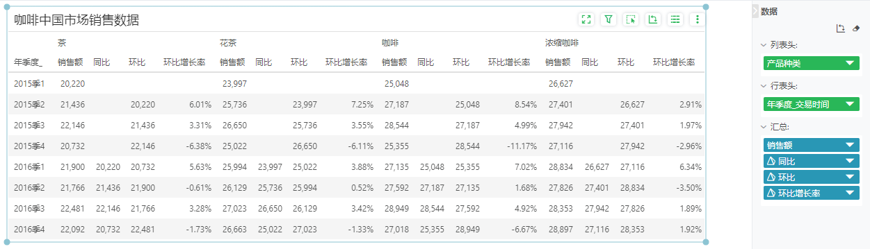 以上通过lookup动态计算函数实现同环比计算。另外Yonghong Desktop支持更多的动态计算,包括差值、百分比、差值百分比、汇总百分比、累积总计、移动计算、排名计算、百分位等,基于这些计算可以轻松实现在可视化图表的数据上的二次计算。