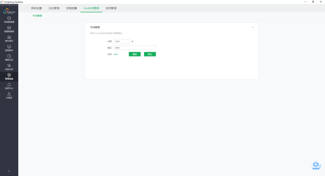 Yonghong Desktop发布之初使用的是MPP高性能计算引擎,从9版本开始升级了高性能计算引擎并命名为VooltDB。可以看到现在Yonghong Desktop内置的是VooltDB引擎,启动后自动起了VooltDB节点,在Server上,VooltDB是收费的,而Desktop上则可以直接使用。