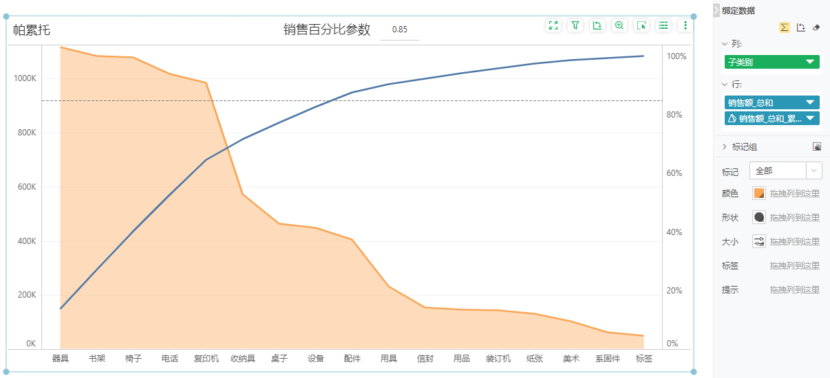 以上例子通过动态计算来实现帕累托图,并通过传参给目标线,实现修改“销售百分比参数”的值,查看不同参数值情况下的子类别分布情况。