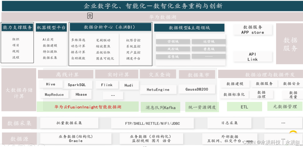 该银行的实时大数据平台依托于华为云 FusionInsight 智能数据湖为数据底座,以永洪BI作为全行的自助式数据分析中心。