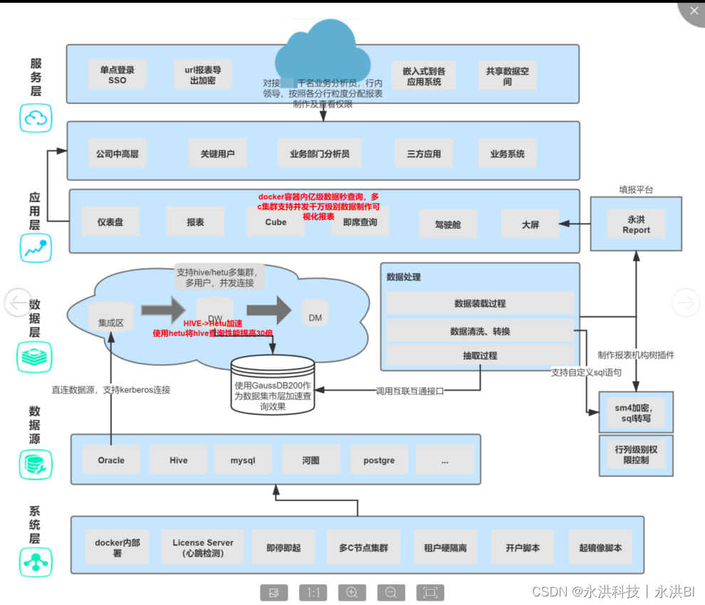 - 服务层:由于行方需要上百台BI系统来满足大规模用户使用需要,采用了分布式docker容器方案,通过启动docker灵活部署的方式+即时BI系统的license server功能,实现了即停即起,license管控,心跳检测,自动杀停等一系列灵活部署的机制。