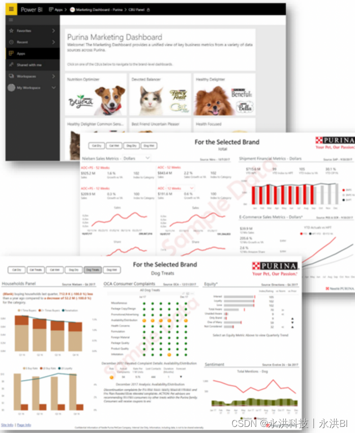 这个仪表板汇总了来自各种内部和外部来源的 Purina 营销数据,包括来自 Nielsen 等媒体机构、定制研究、联合销售来源、社交媒体和销售点的数据。例如Consumer Metrics(消费者指标分析)页面整合了品牌资产、品牌情绪、家庭面板数据和来自各种来源的消费者联系方式,以全面了解品牌的评价程度,并做出精准的决策调整。