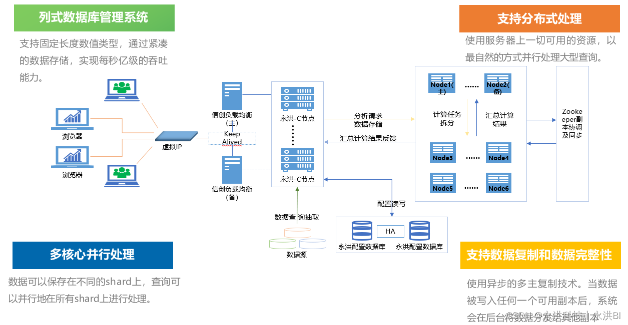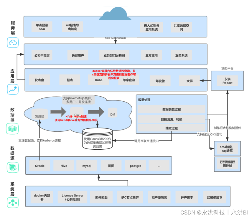 - 为了应对能支持大规模分析场景的落地,部署了200+套docker容器 + BI系统,在用户访问系统时,进行各个docker容器的分发,确保负载均衡。