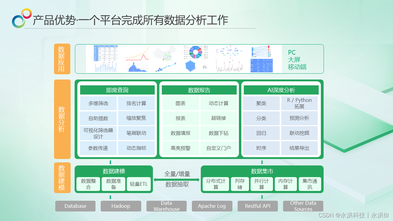 永洪敏捷BI在产品设计初期,便从客户需求的视角出发,以“一站式”的设计理念进行产品架构,使用纯B/S架构,将各系统数据进行统一的整合、存储、分析,将大数据分析所需的产品功能全部纳入一个平台,进行统一管控。数据运行期间,永洪敏捷BI可以全面覆盖数据分析过程中的各个环节,包括数据采集、清洗、整合、存储、计算、建模、训练、展现、协作等,让用户在一个平台上就可以完成全流程数据分析任务,降低了实施、集成、培训成本,让企业轻松实现数据赋能业务的目标。