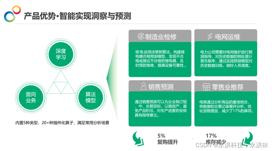 永洪科技作为BI领域的领先者,提出“BI+AI”理念,结合AI增强分析,提供自服务和可视化建模,降低数据分析门槛。通过数据问答、数据解释和数据洞察等功能,实现深度数据应用,帮助企业提升决策效率和业务增长。同时,BI+AI模式在风电等行业的实际应用中,已展现出显著效果,如故障预测模型,有效减少维修成本。