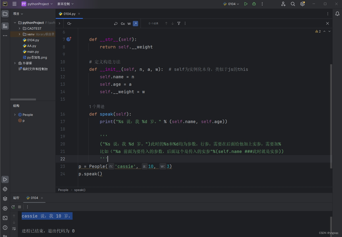 在类的内部,使用 def 关键字来定义一个方法,与一般函数定义不同,类方法必须包含参数self, 且为第一个参数,self代表的是类的实例。