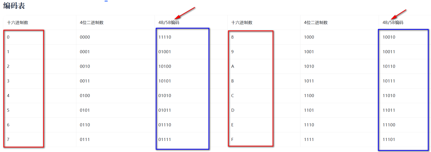 4B/5B编码将每4位数据分组,映射为5位进行传输。5位二进制编码可知有32种组合,其中16种用于表示4位数据的组合,其余16种保留用于控制字符等,该编码确保有良好的AC特性,DC分量控制在10%以为,同时降低低频信号,利于信号传输。其编码表如下表所示: