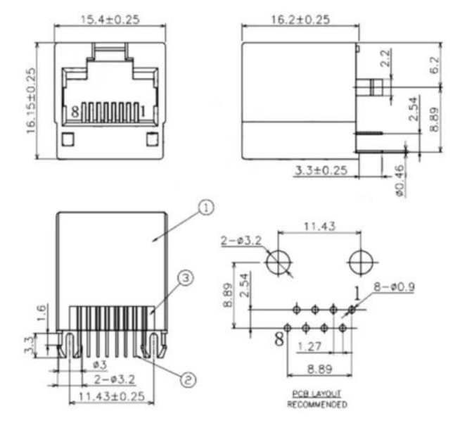 RJ45插座对外接口虽然一致且都是通用的,但实际上RJ45种类有多钟,比如:带网络变压器的、不带网络变压器的、直座的、弯座的,在此不再进行详细对比介绍;只需记住无论是哪种插座其接口定义和对外尺寸都是一样的即都可与对端水晶头互联,且千兆向下兼容百兆网口。RJ45插座(直),不带网络变压器结构图如下图所示。