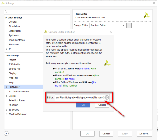 3、打开VIVADO软件,依次操作Tools→Settings→text editor,在current editor一栏中选择custom editor,然后选择对应的路径即可,[file name]与.exe之间记得增加空格,操作如下;