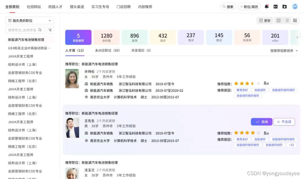 那这种情况要怎么进行改善甚至避免呢?可以采用AI+招聘,使用人工智能筛选功能。这里拿大易智能招聘系统举例,它可以通过智能筛选识别出不适合特定职位的个性或行为模式。然后,招聘人员可以在筛选过程中利用这些洞察力来缩小候选人的范围,并将重点放在潜力更大的候选人身上。这样既减轻了HR的工作难度,又使得优秀人才不外流。