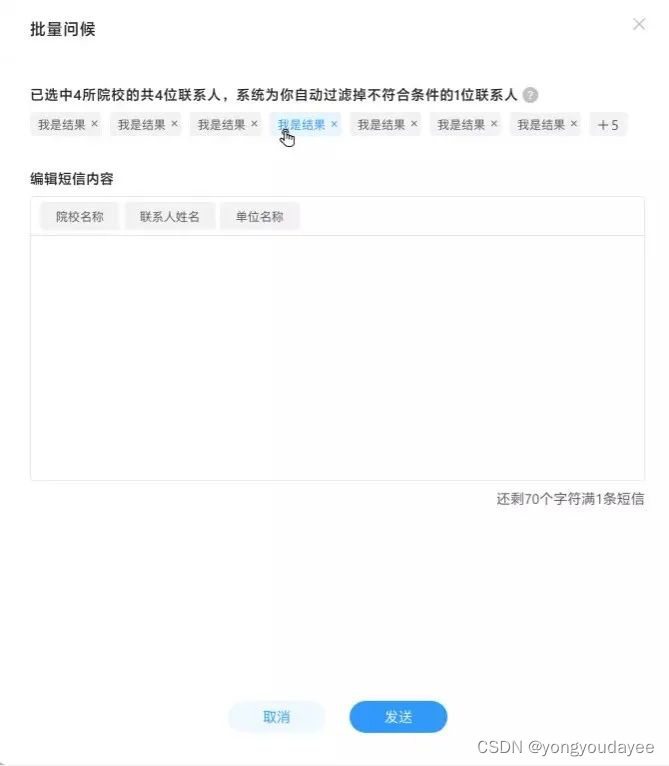 校招离不开企业与校方的密切合作,借助大易招聘系统的「院校通讯录」,企业可以便捷积累和维护院校资源。基于院校通讯录,企业不仅可以记录企业合作院校基本情况,合作项目、历史拜访等信息,还支持HR批量维护多个院校的联系人,以短信的方式向他们表达问候或传递信息,发送信息时还可选择姓名、院校等变量信息,传达个性化的关怀。