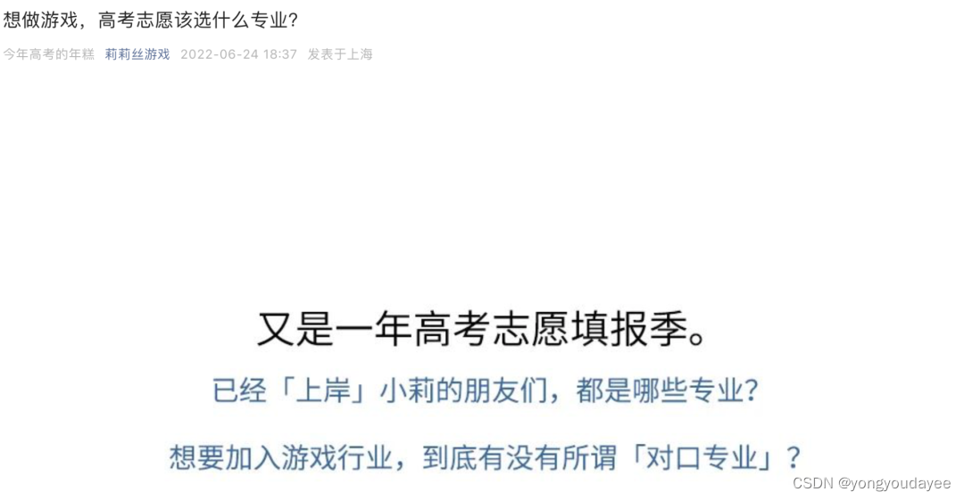 在别的企业还在觊觎大一大二学生的时候,有的企业已经打起了高中生的主意,6月末,高考成绩一出,莉莉丝已经开始教高中生填志愿了,当然腾讯、阿里等大厂也早已做过这样的尝试,这些企业会在高考季顺势做一波内部员工专业的盘点,向想要选专业的学生们透露一小下,哪些专业在大厂更吃香。