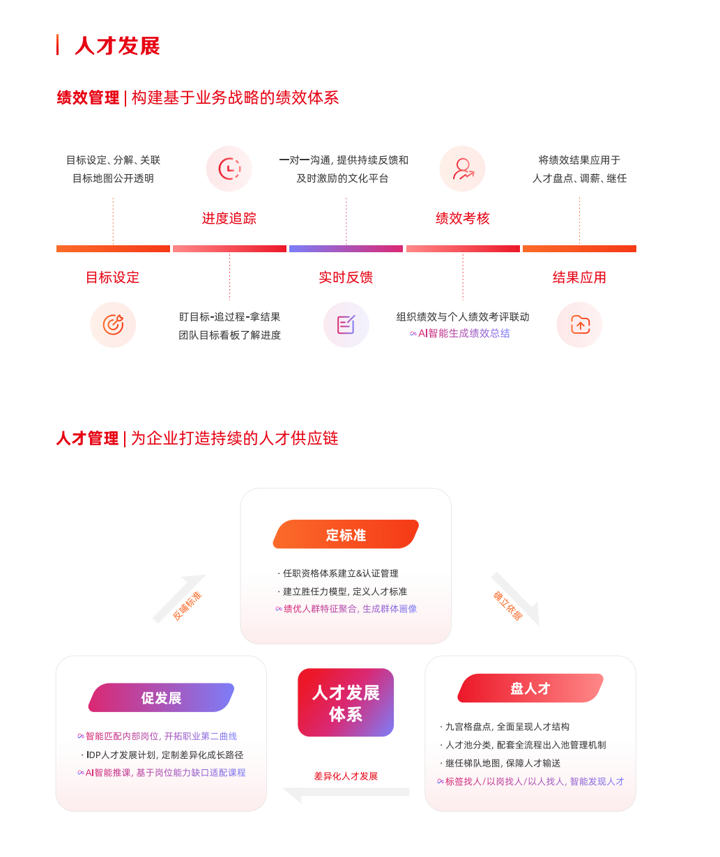 人才发展场景:以人才能力提升与继任发展为核心,构建 AI 驱动的人才发展闭环,具体功能包括:AI 人才全息评估、AI 人才盘点、AI 绩优人才画像、AI 潜在人才推荐、AI 相似人才推荐、AI 人才智搜等,助力企业精准识别核心人才、制定个性化发展路径。