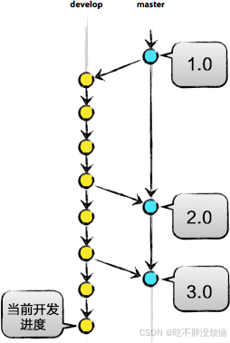标签是用于标记特定的点或提交的历史,通常会用来标记发布版本的名称或版本号(如:publish/0.0.1),虽然标签看起来有点像分支,但打上标签的提交是固定的,不能随意的改动,参见上图中的1.0 / 2.0 / 3.0