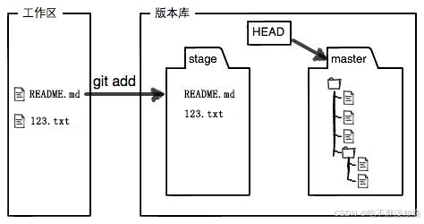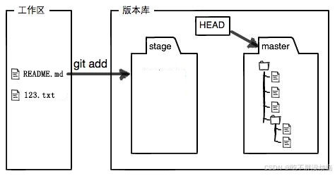 Git的版本库里存了很多东西,其中最重要的就是称为stage(或者叫index索引)的 暂存区 ,还有Git为我们自动创建的第一个分支master,以及指向master的一个指针叫 HEAD。