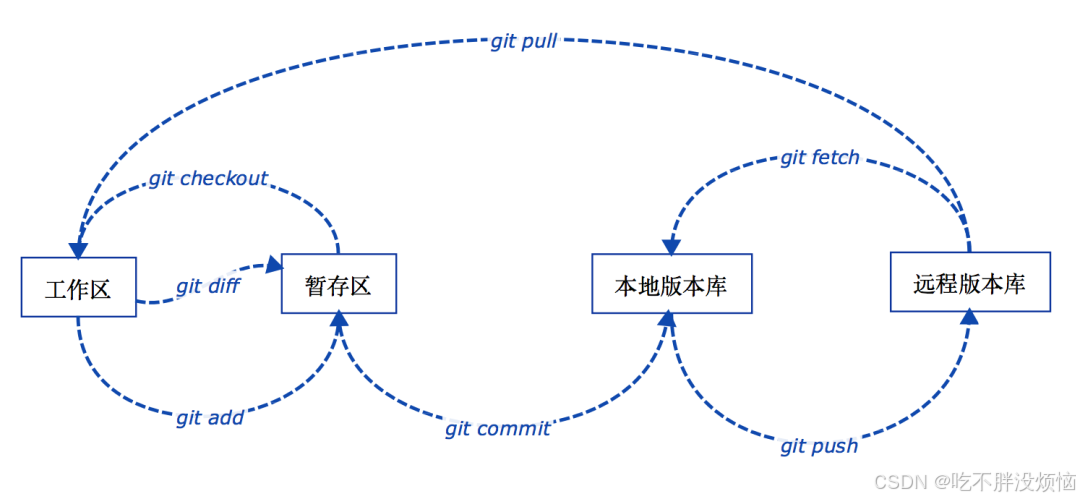 工作区、暂存区、本地版本库、远程版本库之间几个常用的 Git 操作流程如下图所示: