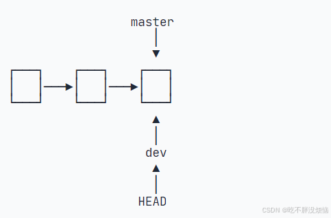 当我们创建新的分支,例如dev时,Git新建了一个指针叫dev,指向master相同的提交,再把HEAD指向dev,就表示当前分支在dev上: