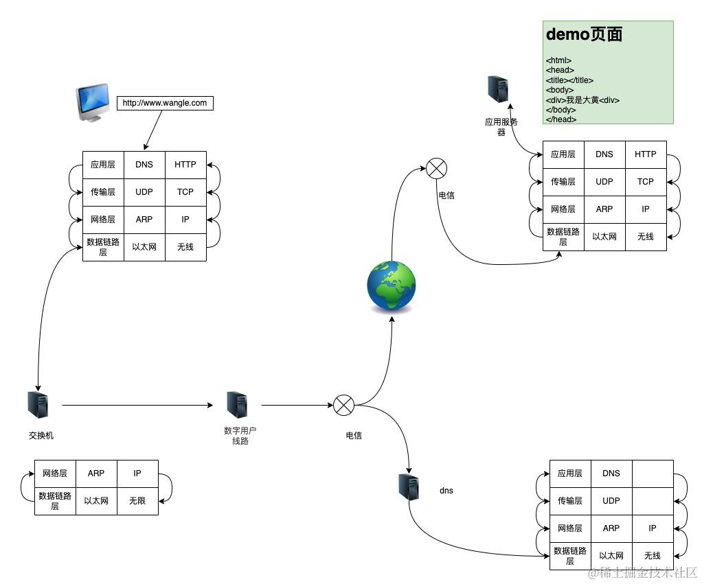 - 接收端则反向操作:从物理信号中解析出 IP 包,再提取 TCP 数据段,最后还原成 HTTP 数据,交给浏览器处理。