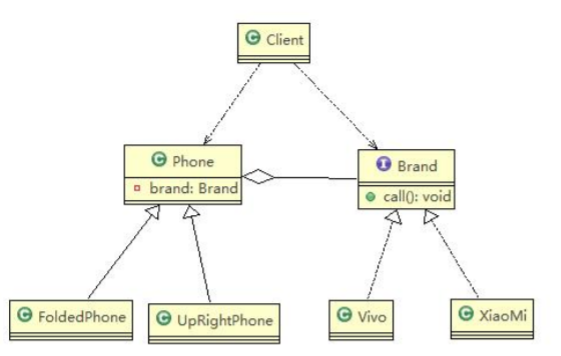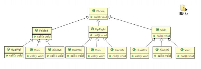 - 扩展性问题(类爆炸),如果我们再增加手机的样式(旋转式),就需要增加各个品牌手机的类,同样如果我们增加一个手机品牌,也要在各个手机样式类下增加。