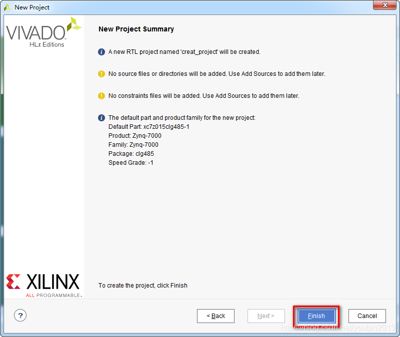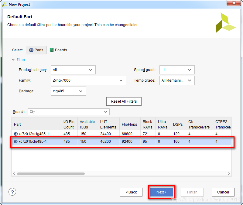 7,出现对话框如图7所示,该步骤选择芯片的类型,本工程建立在7015型号上,所以选择xc7z015clg485-1,然后点击下一步。