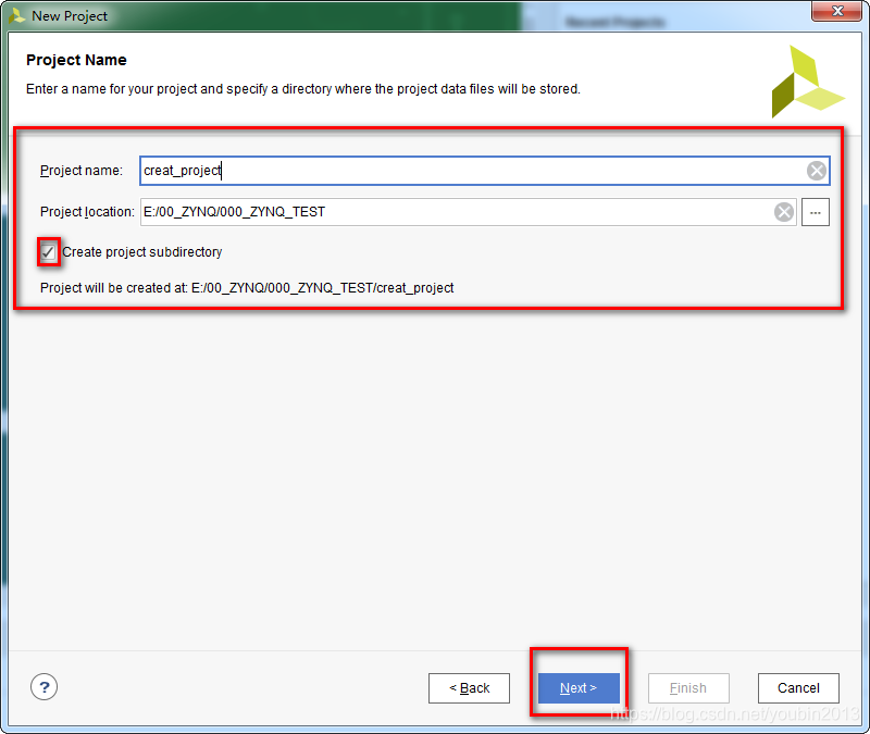 3,此时会出现一个对话框如图3所示,这一步给工程命名,并且确定工程的保存路径,下面的小勾表示创建一个和工程名字相同子目录,然后点击下一步。
