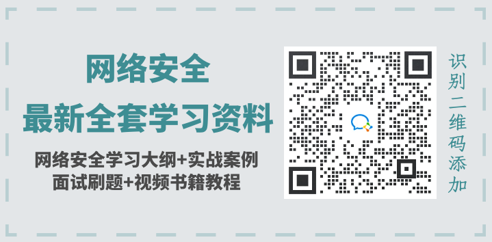 朋友们如果有需要全套网络安全入门+进阶学习资源包,可以点击免费领取(如遇扫码问题,可以在评论区留言领取哦)~
