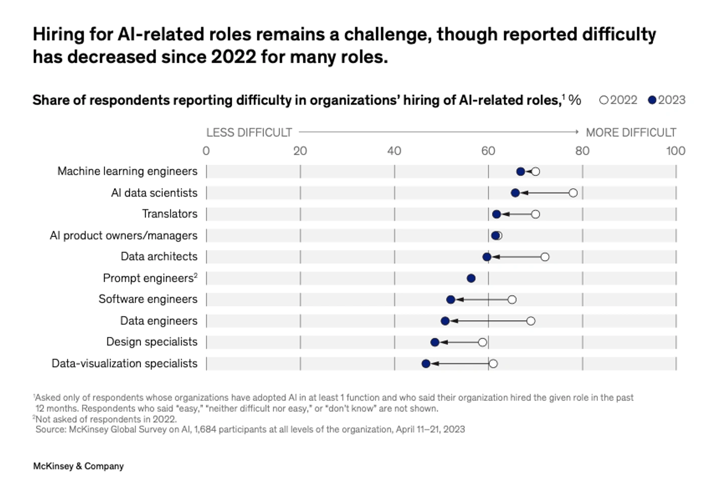 研究发现:招聘与人工智能相关的角色仍然是一个挑战,但在过去的一年中已经变得相对容易一些。这可能反映了从2022年底到2023年上半年,科技公司大量裁员的情况。与之前的调查相比,回应者中报告招聘诸如 AI 数据科学家、数据工程师和数据可视化专家等角色困难的比例有所减少。尽管如此,回应者表示,招聘机器学习工程师和AI产品负责人的难度与去年相比依然很大。