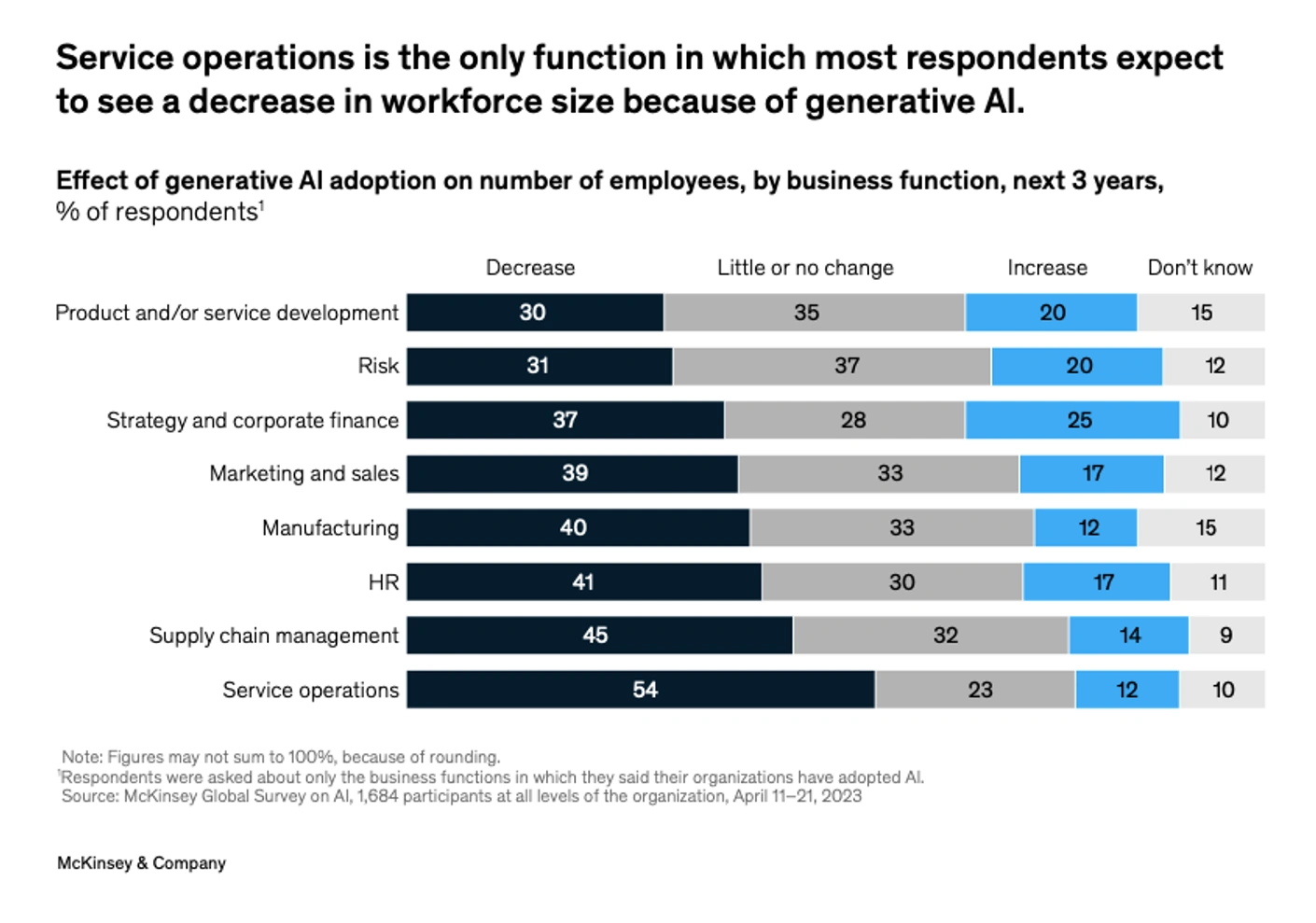 具体来看,对于通用 AI 的预测影响,服务运营是唯一一个大多数回应者预期其组织的劳动力规模将减少的职能。对于产品和开发来说,回应者反馈减少的比例是非常低的。这一发现与我们最近的研究结果大体一致:虽然通用 AI 的出现增加了我们对可自动化工作活动比例的估计(从 50% 增加到 60% 至 70%),但这并不一定意味着整个角色的自动化。