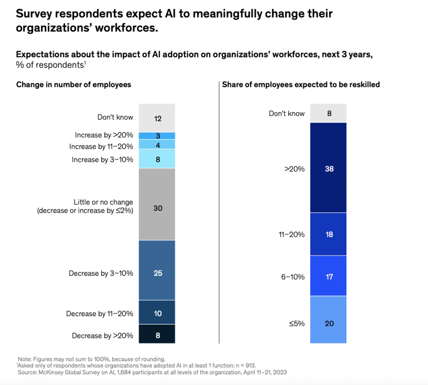38% 采用 AI 的回应者预计,他们公司的劳动力中将有超过20% 的人将接受再培训,而 8% 的回应者表示他们的劳动力规模将减少超过 20%。