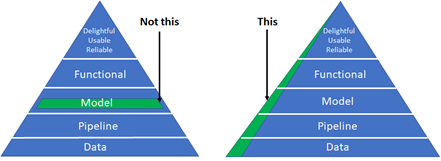 如前所述,有必要用最简单的 AI 模型构建出小型管道,从而创建用户体验并收集反馈。Jussi Pasanen 的最小可行产品(MVP)金字塔模型可以根据 AI 产品进行调整,如下所示: