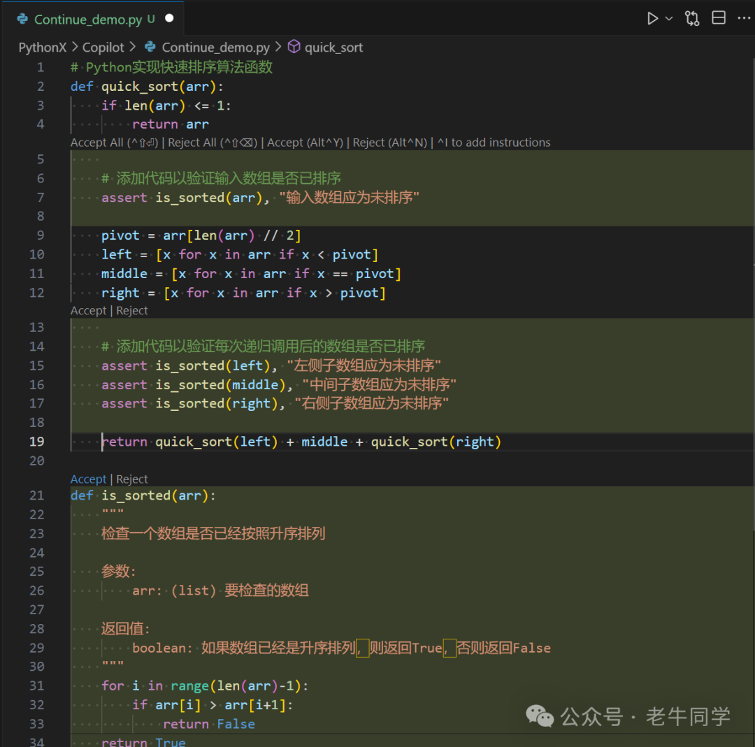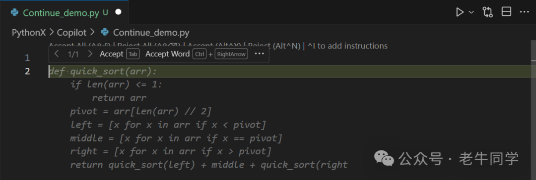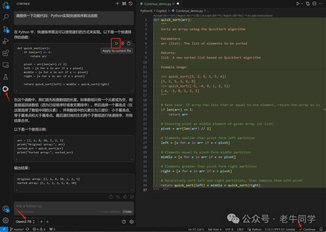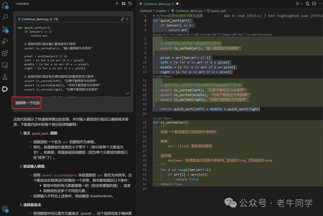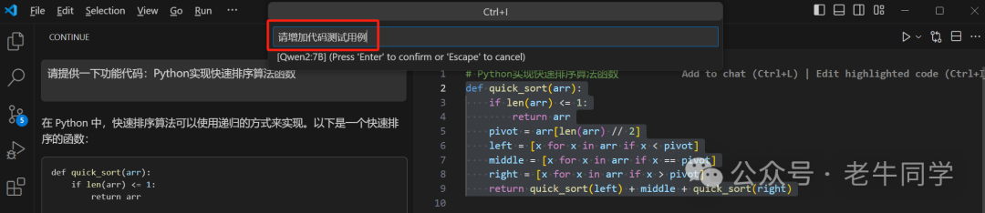 使用方式二: 代码生成,也是本文的重点,下面老牛同学以快速排序算法为例,来如何利用Continue完成代码编写: