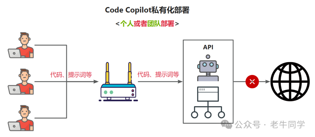 针对小团队私有保密项目、创新团队孵化新产品,隐私安全问题就显得格外重要。因此,团队内部部署私有的Code Copilot方案就应运而出了: