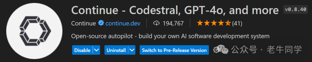 Code Copilot Continue是目前最受欢迎的插件之一,它插件的形式使用,目前支持VS Code和JetBrains 全家桶这 2 个主流 IDE 的扩展,可以在对应的插件市场中直接搜索Continue下载安装。Continue插件的一个最大优势在于它可以指定连接本地或者局域网内的大模型,所以对于信息安全高的项目,我们完全可以在本地或者局域网内部署大模型,然后用Continue插件连接使用,在提高开发生产效率同时保护了研发代码的隐私。目前Continue插件的社区活跃,GitHub 仓库已达12K星,插件版本更新频繁,越来越成熟。