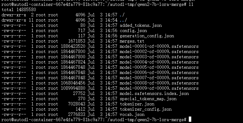 模型训练完成后,我们可以将训练完后的Lora相关权重文件,和基础模型进行合并导出生成新的模型