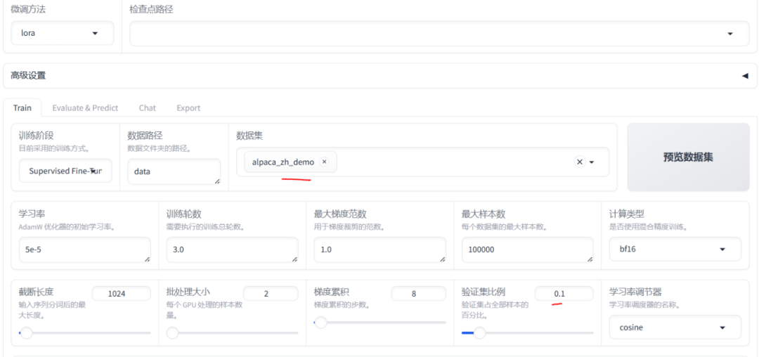 微调配置是整个流程中至关重要的一步。用户需要根据具体的任务需求,设置训练阶段、数据集、学习率、批次大小等关键参数。