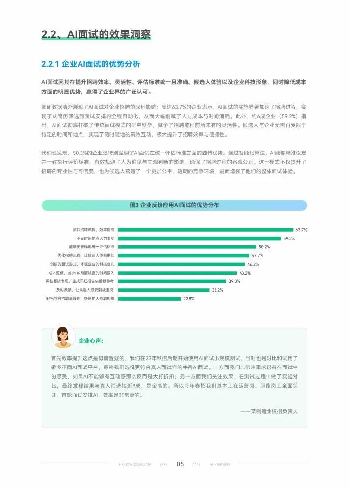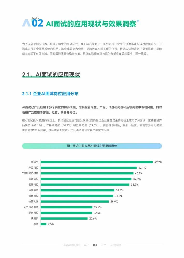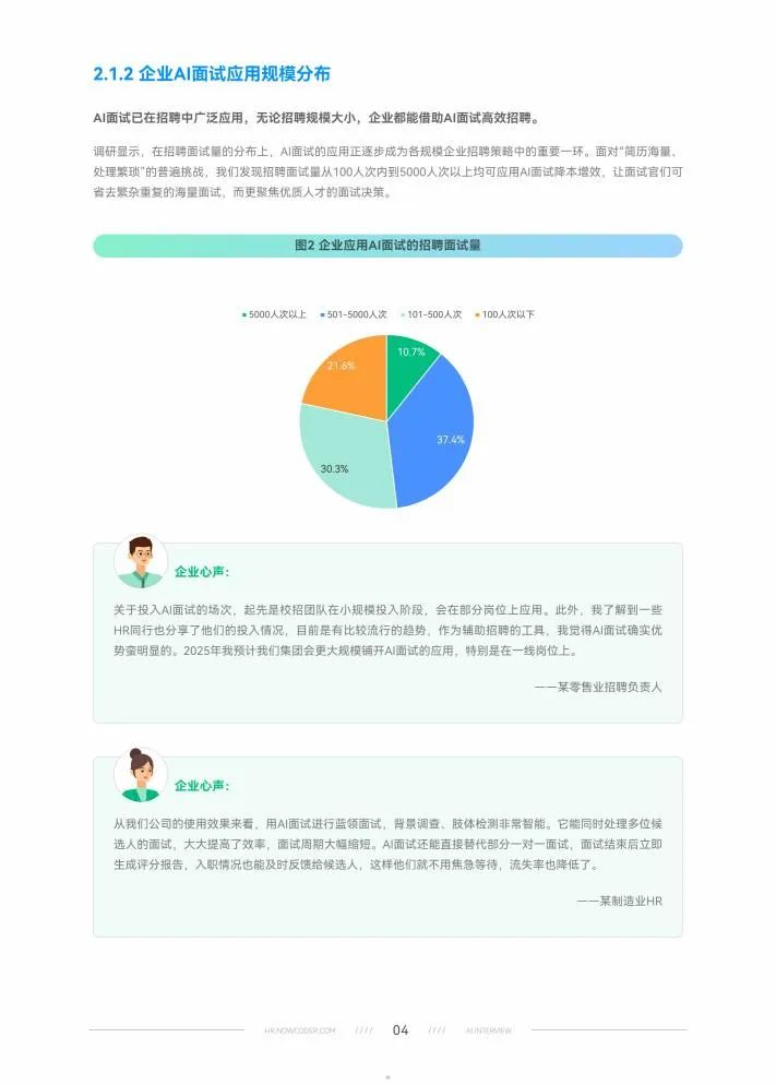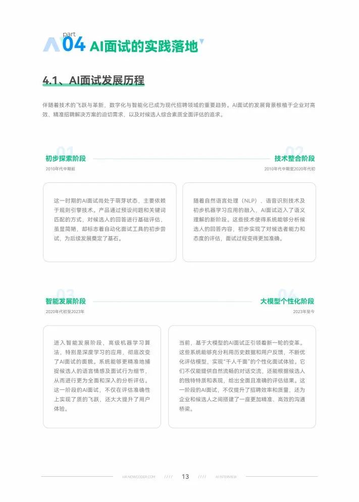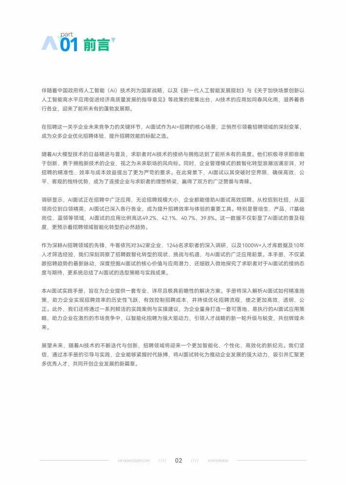此份手册介绍了AI面试在招聘领域的广泛应用与前景,分析了其应用现状、技术发展和企业的实践案例。随着AI技术的进步,AI面试成为企业提高招聘效率和降低成本的重要工具。通过对互联网、制造、快消等多个行业的调研,报告指出AI面试不仅提升了招聘的透明度和公平性,还能打破时间和地域限制,显著加速招聘流程。AI面试的广泛应用特别集中于管培生、产品和蓝领岗位,企业的AI面试普及率不断上升,展现了招聘智能化转型的必然趋势。报告提供了多项实际案例,并探讨了未来AI面试的应用前景。
