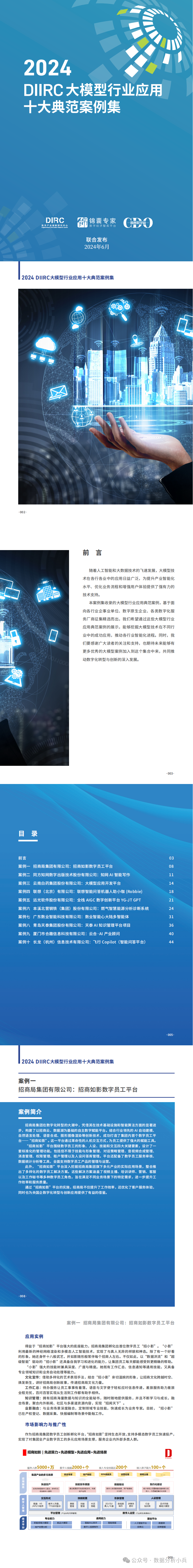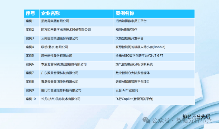 本案例集汇集了文化、医药、IT、钢铁、航空、企业服务等行业在大模型应用领域的典范案例。充分展示了大模型技术在解决实际问题、推动产业升级方面的巨大潜力和价值。典范案例列表如下: