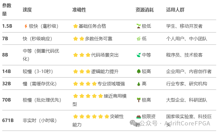 选择模型版本,在人工智能领域,模型名称中的 1.5B、7B、8B 等数字代表模型的参数量(Parameters),其中 B 是英文 Billion(十亿) 的缩写。参数越多,模型通常更“聪明”(能处理更复杂的任务),但对硬件资源(显存、内存)的要求也更高。个人用户可优先 7B(通用性最佳),若设备较弱则选 1.5B,开发者可选 8B。