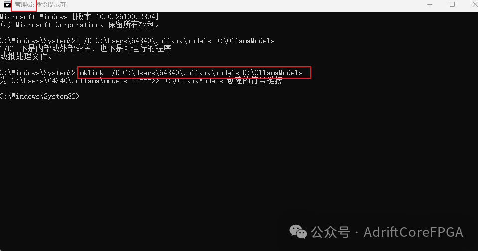 用管理员打开cmd,进行符号链接,然后再下载deepseek文件夹: