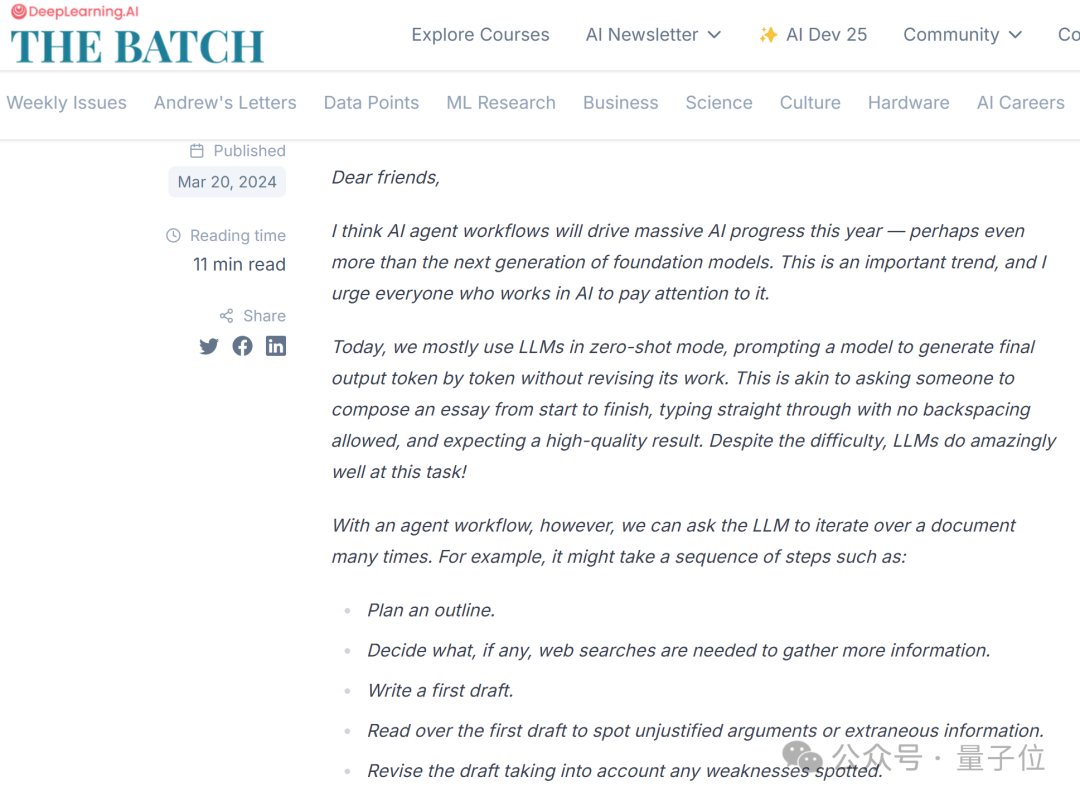 当时他就提到,就像大语言模型(LLMs)在零样本模式下工作(提示模型逐个生成最终输出token,而不修改其工作),Agent在执行一系列步骤(如规划、执行、反思等)后可能比单次产生更好的效果。