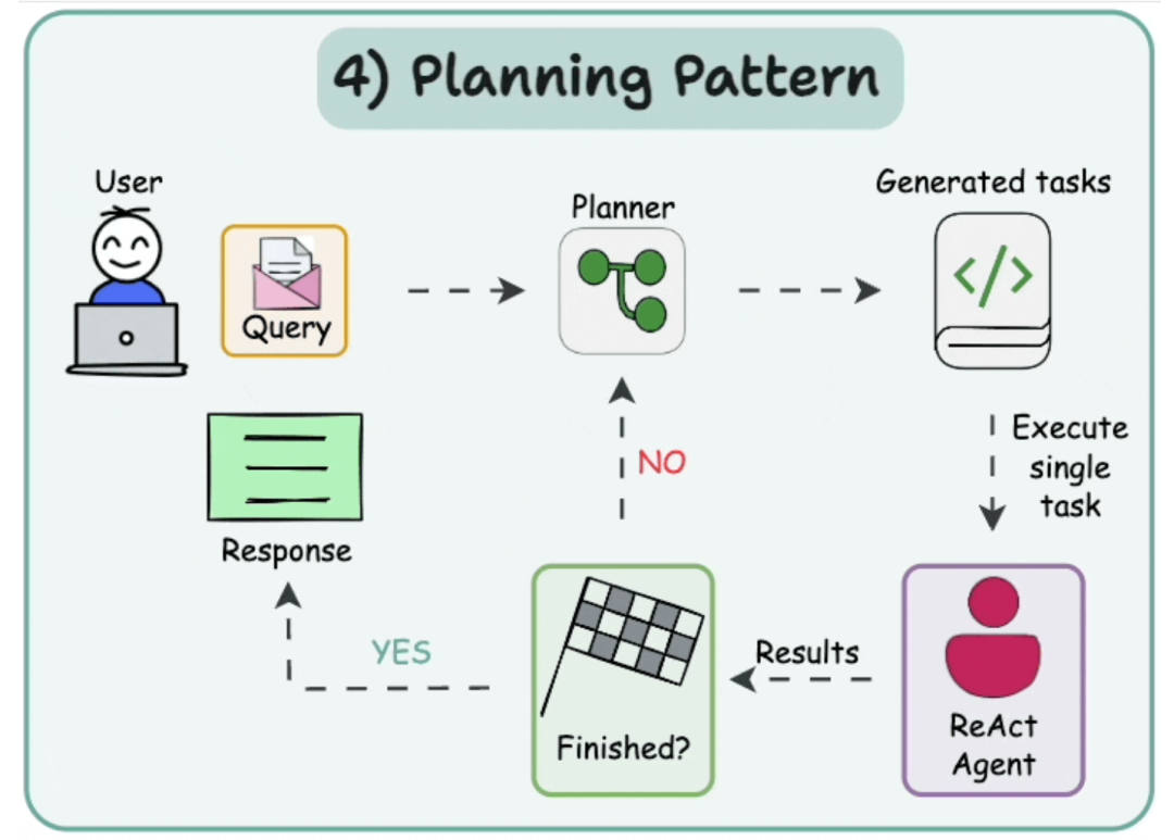 这对简单或高度不确定的任务非常有效,但对于受益于全局观的多步骤问题可能效果不好。Planning模式通过细分任务和概述目标,Agent可以获得对问题的整体看法,更具有战略性和更高的效率。