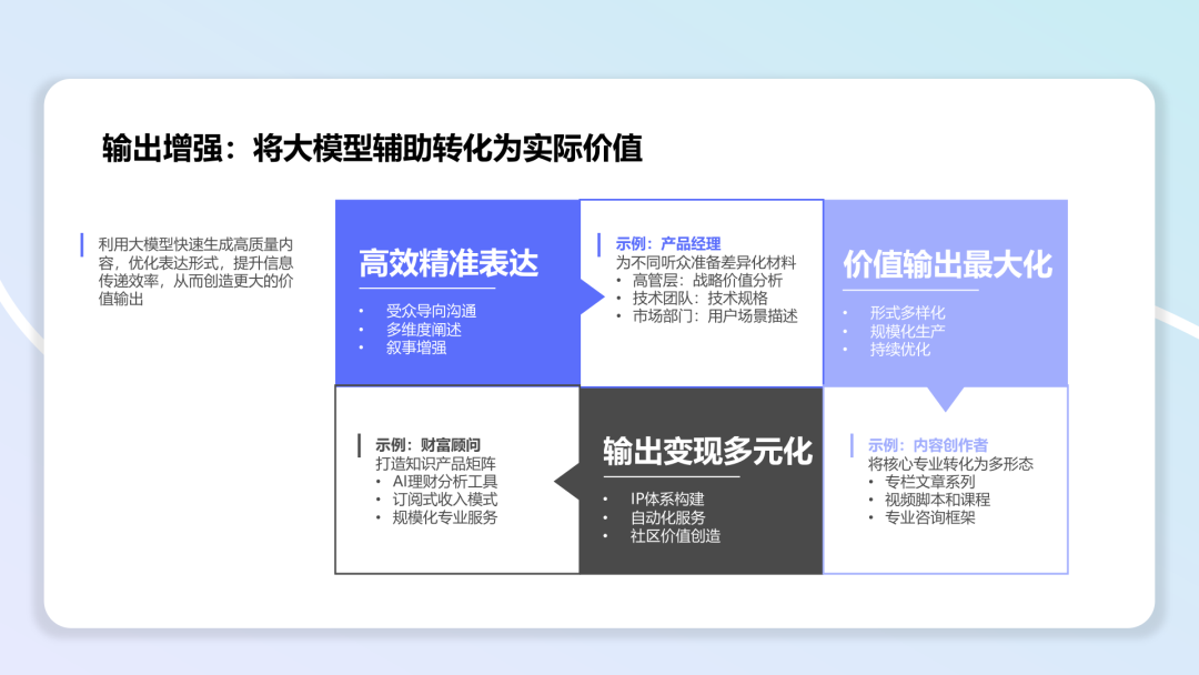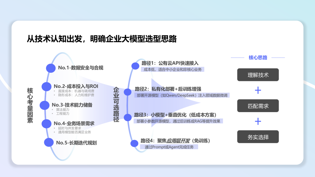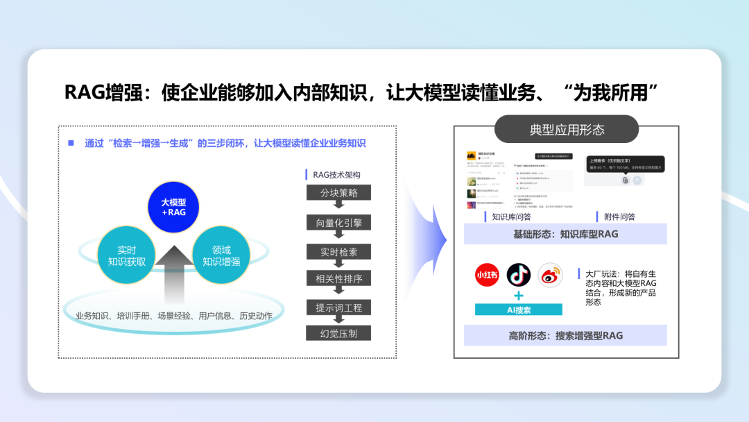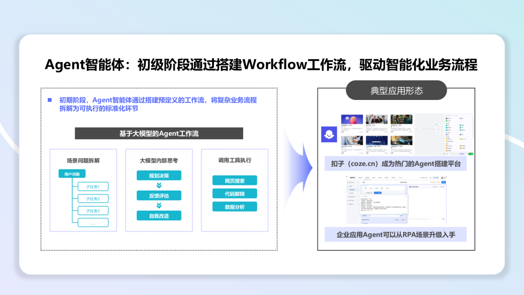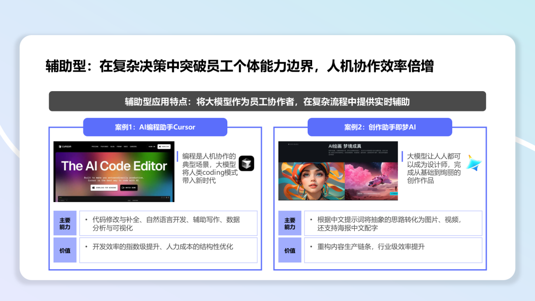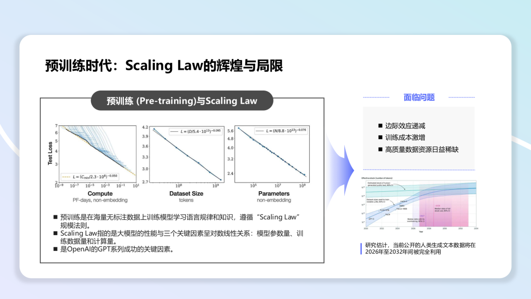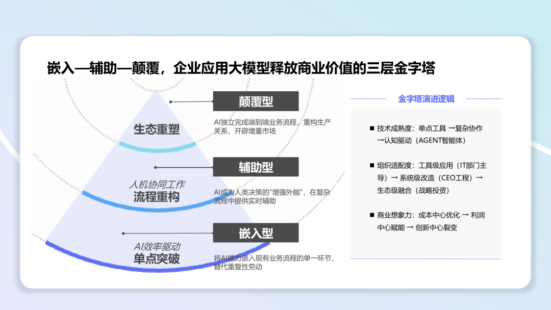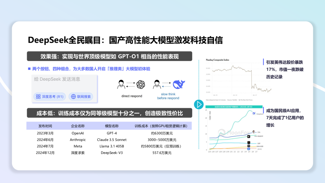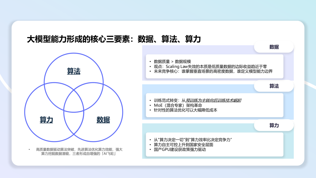 导读:报告系统梳理大模型发展脉络、技术原理与应用路径,为企业与个人应对 AI 时代提供全面指引。大模型发展进入中国加速期。AI 2.0 时代以海量数据训练催生通用智能,中国开源战略成果显著,DeepSeek-V3 训练成本仅 557.6 万美元,为同等级模型十分之一,7 天增长 1 亿用户,性能比肩 GPT-O1。技术层面,大模型能力依赖数据、算法、算力三要素,当前从预训练时代转向后训练时代,通过监督微调、强化学习等技术突破 Scaling Law 边际效应递减瓶颈,DeepSeek 通过两阶段 SFT+RL 策略强化推理能力。企业应用需掌握 “三板斧”。Prompt 工程通过结构化模板实现低成本场景落地,如会议纪要生成;RAG 增强结合企业知识库解决知识实时性问题,需注重文档分块策略;Agent 智能体拆解复杂业务流程,当前多为预设工作流,未来向自主响应环境的真智能体演进。商业价值释放分三层,嵌入型优化单点流程,如钉钉会议 AI 纪要;辅助型提升人机协作效率,如 AI 编程助手 Cursor;颠覆型重构商业模式,如 AI 数字员工。