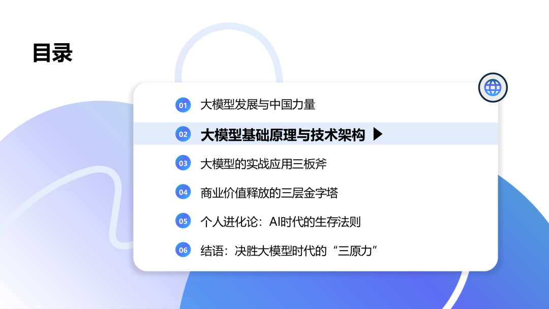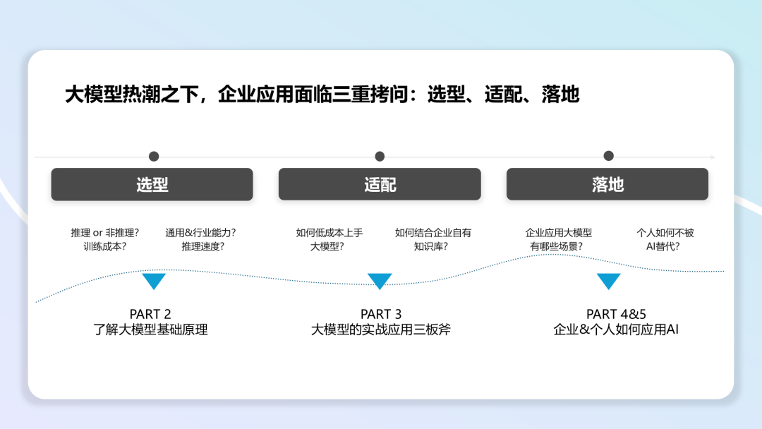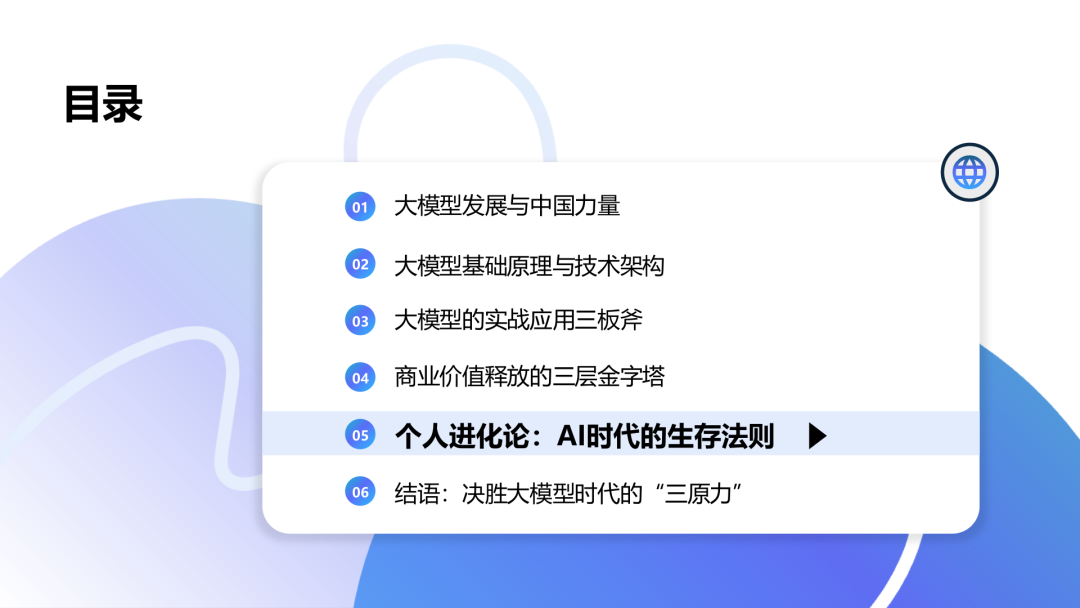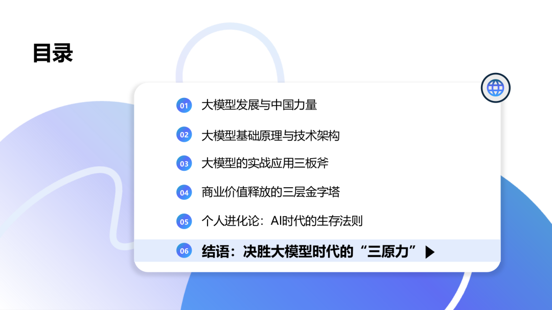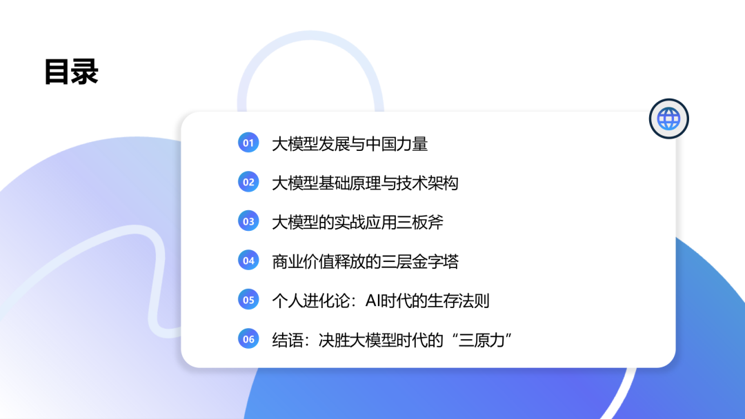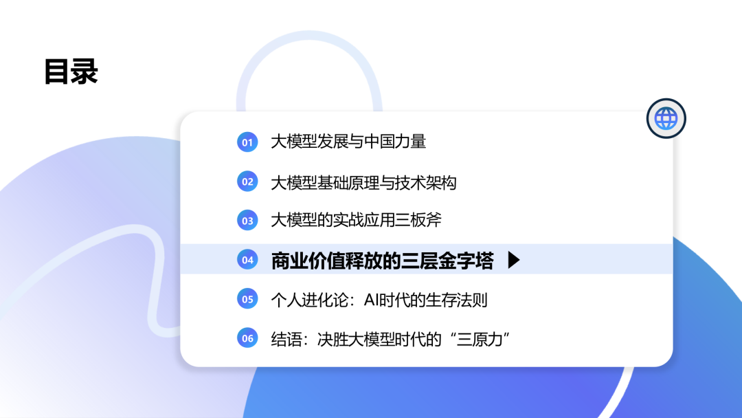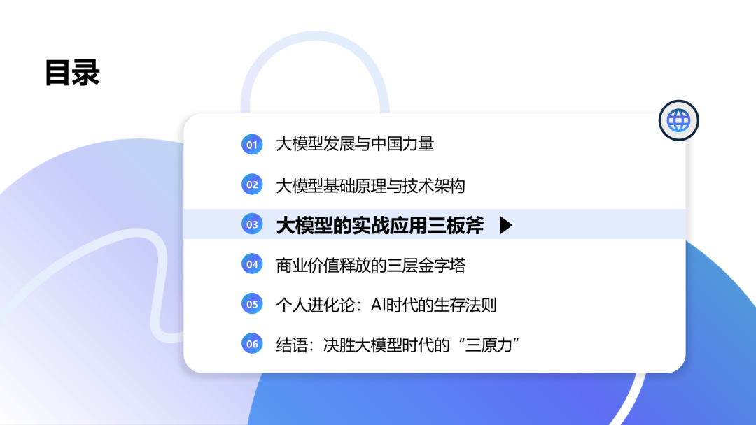 大模型发展进入中国加速期,依赖数据、算法、算力三要素,从预训练转向后训练时代。企业应用需掌握"三板斧":Prompt工程实现低成本场景落地,RAG增强结合企业知识库解决实时性问题,Agent智能体拆解复杂业务流程。商业价值分三层:嵌入型优化流程、辅助型提升协作效率、颠覆型重构商业模式,为企业与个人应对AI时代提供全面指引。