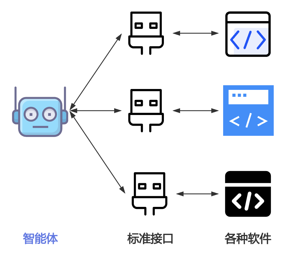 当我们有多个软件程序,就编制多个“函数“(API),这样当智能体需要使用某个程序的时候,就直接“调用”这个“函数“就可以了。
