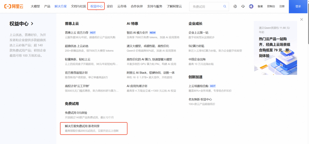 如果您想免费体验更多技术解决方案,可以登录aliyun.com,点击权益中心-解决方案免费试用领取100点试用点。
