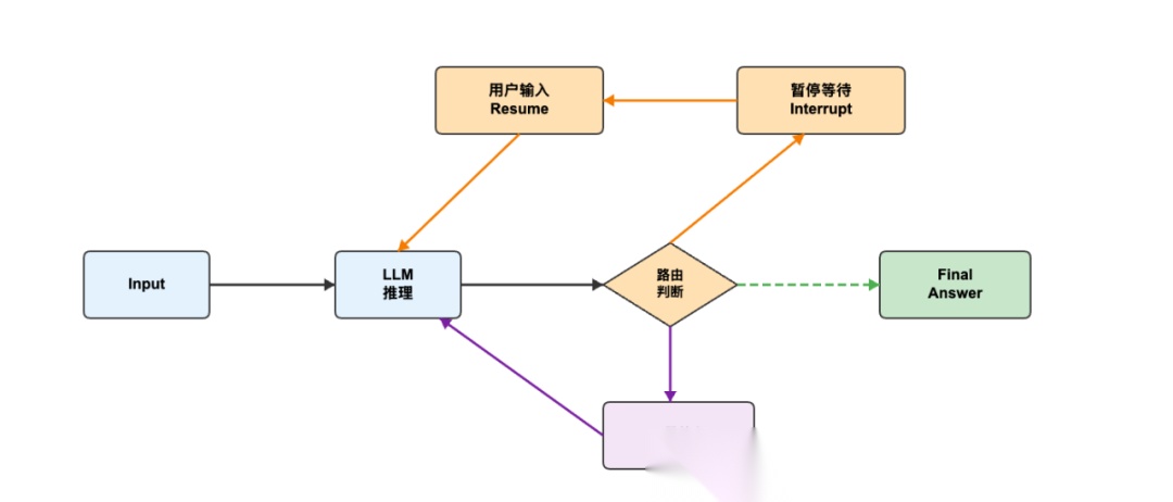 export asyncfunction runHumanLoopAgent( query: string, getUserInput: () => Promise<string>): Promise<string> {const app = buildHumanLoopGraph()const threadConfig = {configurable: {thread_id: '123'}}// 第一次启动let result = await app.invoke({query, messages: []}, threadConfig)// 检查是否需要人工输入const lastMessage = result.messages[result.messages.length - 1]if (lastMessage.tool_calls?.[0]?.name === 'ask_user') { console.log('\n[等待用户输入...]') const userInput = await getUserInput() // 恢复执行(关键:使用 Command + resume) result = await app.invoke(new Command({resume: userInput}), threadConfig) }return result.messages[result.messages.length - 1].content}