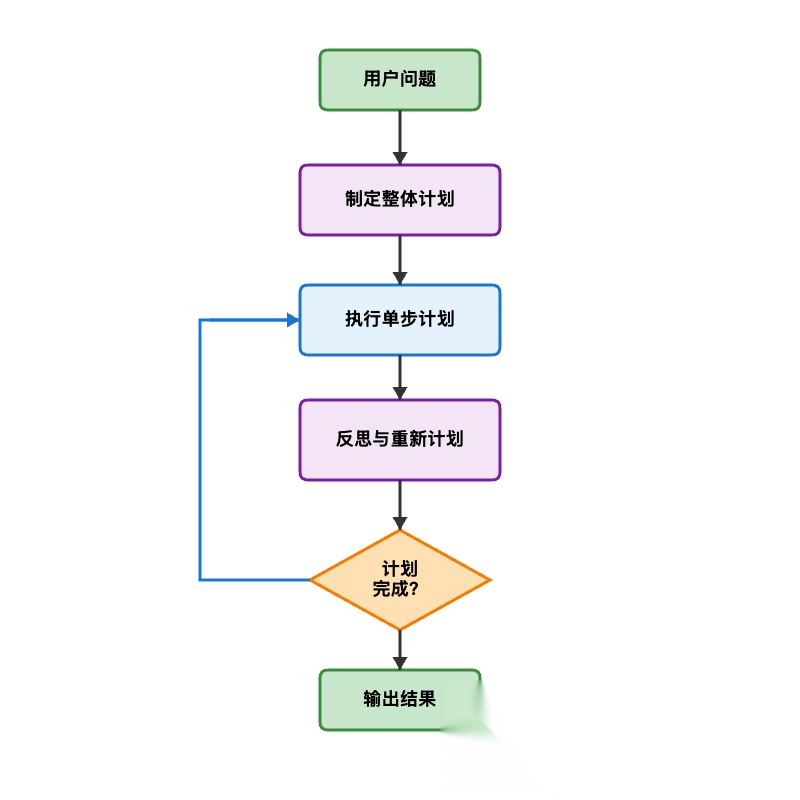 计划模式采用"先计划,后执行"的策略。ReAct 每步都需重新思考,适合探索性任务;计划模式则在开始时制定完整方案再逐步执行,更适合结构化程度高的任务。优势在于执行路径清晰、便于监控进度和预测资源消耗。但灵活性较低,初始计划不准确时可能需要人工调整。