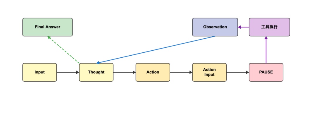 流程图展示了 ReAct 的完整执行过程。在底部的主流程中,Input 经过 LLM 推理后依次生成 Thought、Action、Action Input 和 PAUSE 标记。PAUSE 触发工具执行,执行结果形成 Observation 并返回给 LLM,由此形成一个闭环。当 LLM 判断已获得足够信息时,会从 Thought 节点输出 Final Answer,结束整个流程。