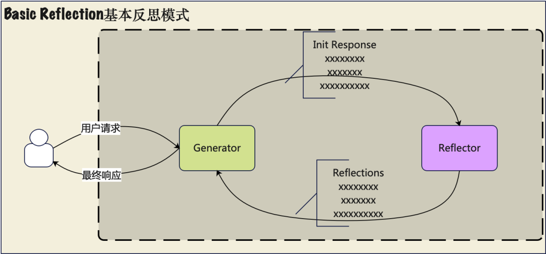 Basic Reflection 是自我反思模式的一种具体工程实现范式,特指通过两个独立 Agent(生成器 Generator 和评估器 Reflector)形成闭环交互的架构。其核心设计思想是: